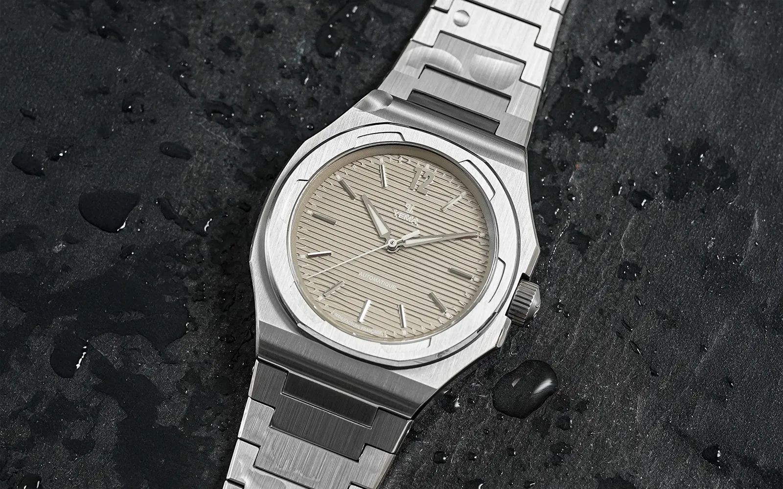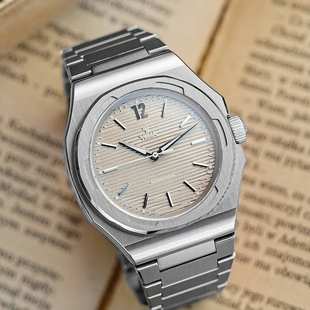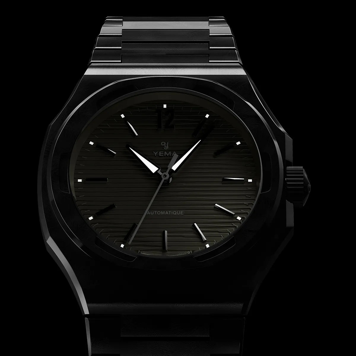 YEMA's iconic integrated bracelet model returns in a slimmed down version equipped with our in-house micro-rotor caliber, which unique decoration is visible through an exhibition case-back, and a striped dial adorned with raised hour markers matching the faceted hands. This elegant sports watch offers the perfect blend of modernity and comfort for everyday wear.