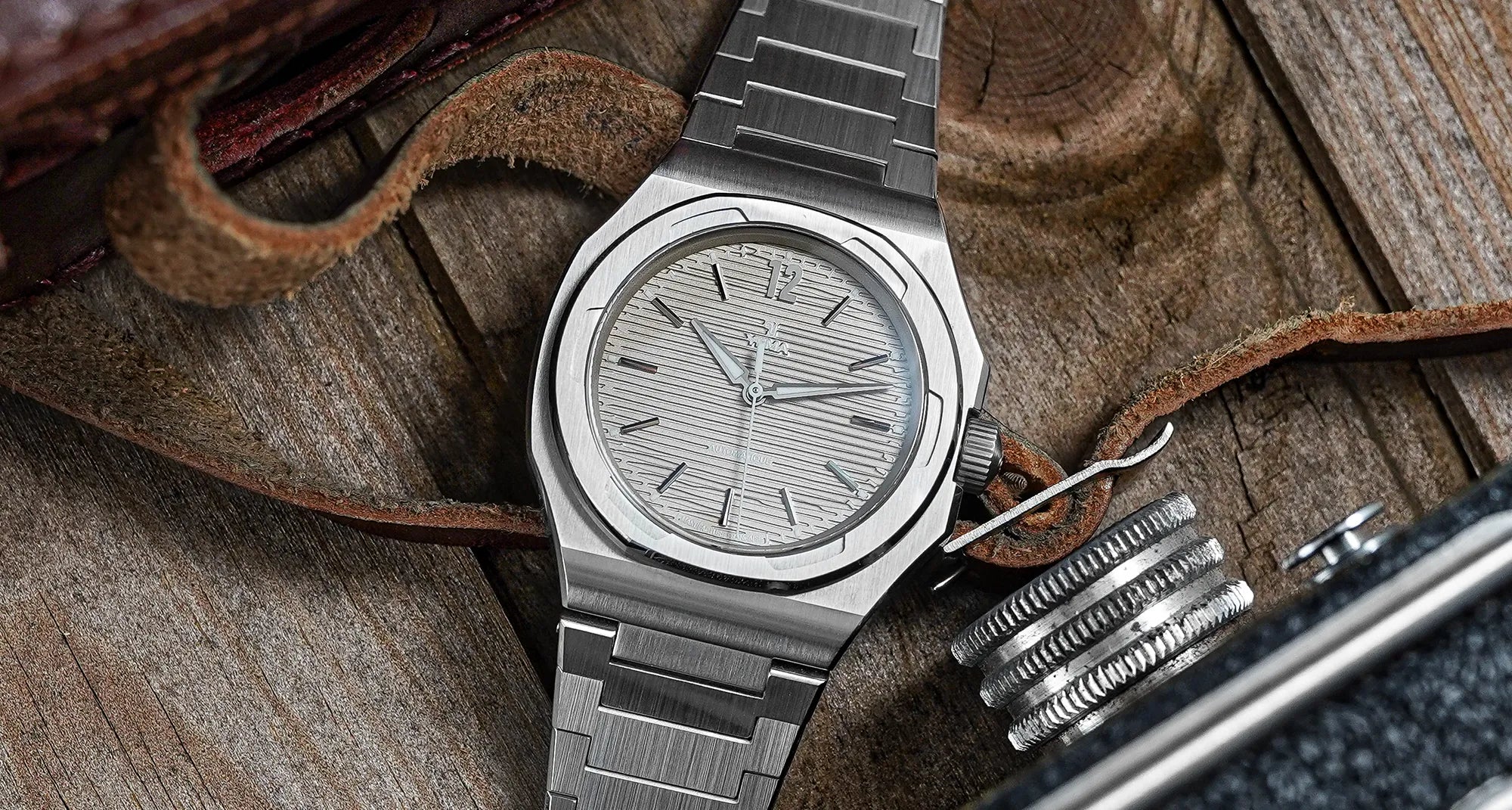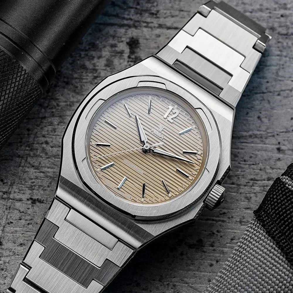 The captivating dial features refined irregular stripes on the vertical edges inspired by natural patterns which design captures the essence of sea waves, desert sand ripples, or wind-carved patterns. The stainless steel raised hour markers and faceted hands play with light and shadow, creating a dynamic visual effect that is both distinctive and elegant.