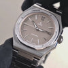 The continuous pattern of vertical brushed surfaces and polished angles naturally extends all the way from the top of the bezel, to the case and further into the integrated steel bracelet, creating the appearance of seamless integration. The tapered links on the integrated bracelet continue the effect, vertical brushed surfaces continue meeting polished angles all the way to the double folding clasp.