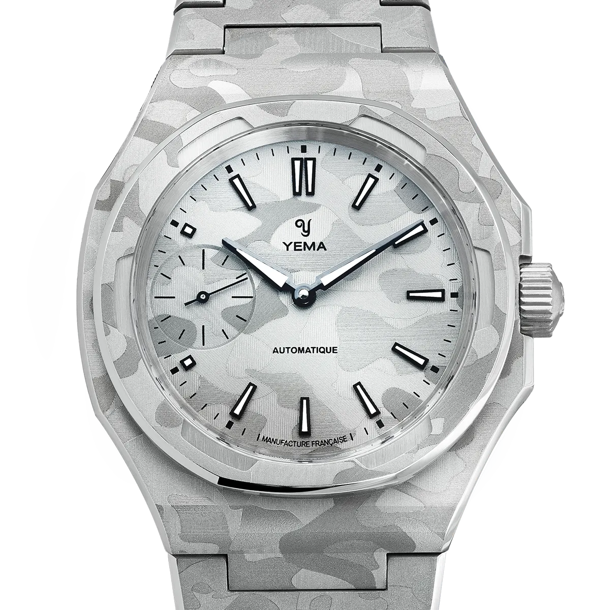 Inspired by a YEMA Sous-Marine bezel from the 1980s, the Wristmaster bezel frames the dial with strong geometry and refined finishing. On this edition, the bezel is also laser-finished with the snow camo motif, extending the design seamlessly beyond the dial. The result is a constant play of highlights and shadows, technical, architectural, and unmistakably Wristmaster.