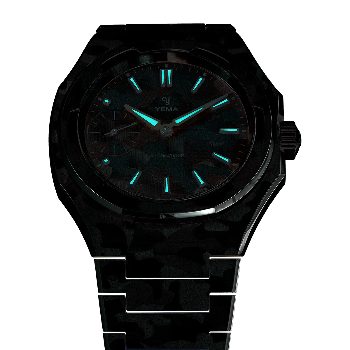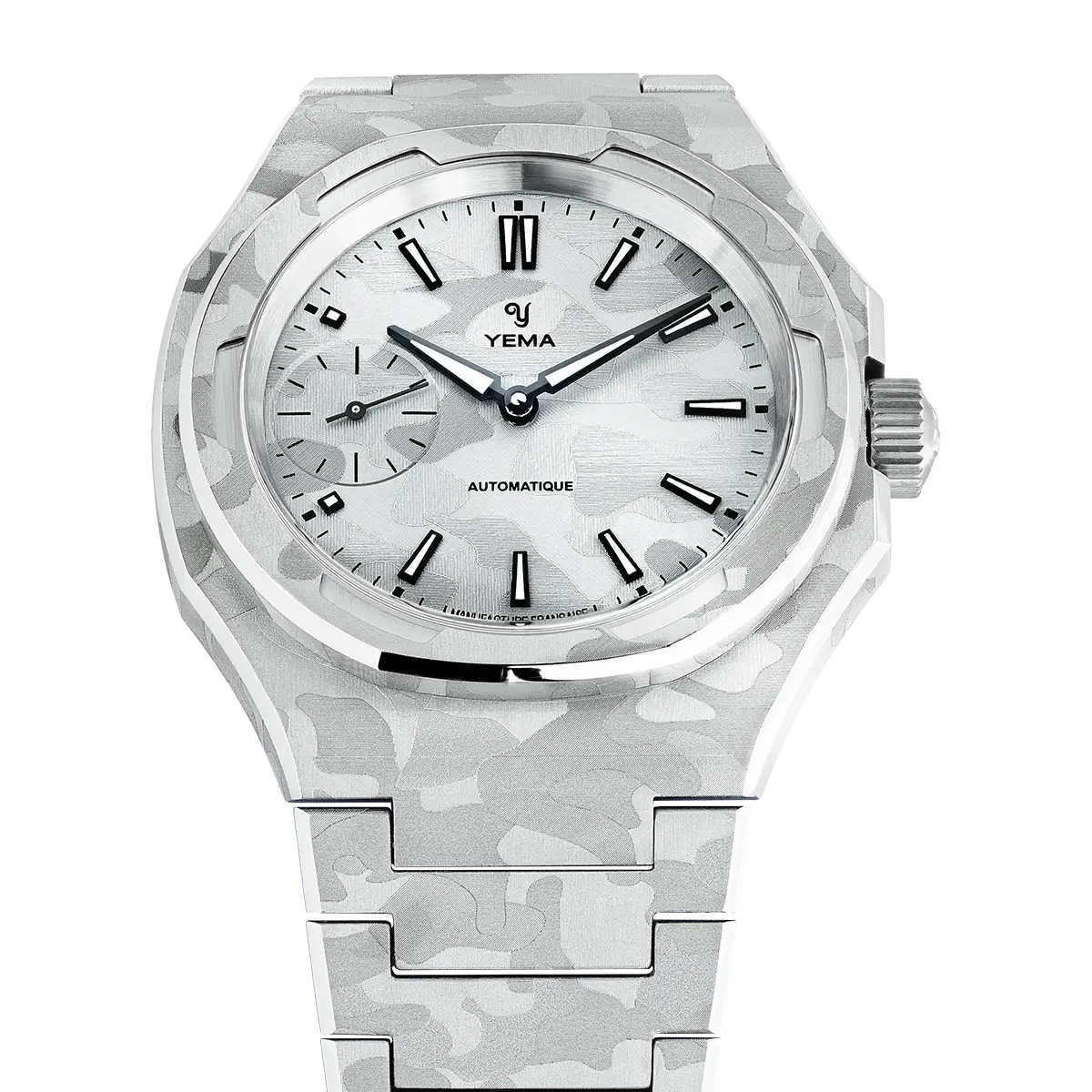 The "snow" camouflage pattern is applied by laser finishing on the dial, case, and bracelet, creating a contemporary and refined visual signature. This subtle monochrome treatment reveals itself differently depending on the angle of light, offering a discreet and modern look designed with collectors in mind.