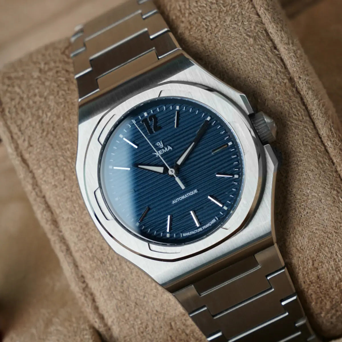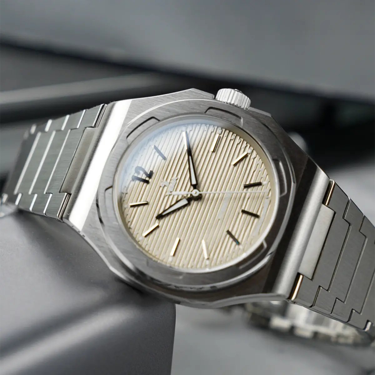 The continuous pattern of vertical brushed surfaces and polished angles naturally extends all the way from the top of the bezel, to the case and further into the integrated steel bracelet, creating the appearance of seamless integration. The tapered links on the integrated bracelet continue the effect, vertical brushed surfaces continue meeting polished angles all the way to the double folding clasp.